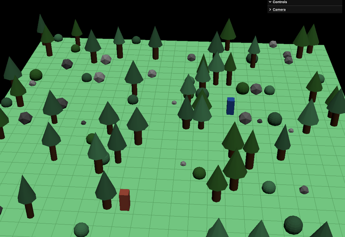 I had more fun with ThreeJS tonight. I increased the size of the board and added some trees and boulders to it. I am now at a point where I will focus more on building a representation of the board as an object to start moving my character around the board.