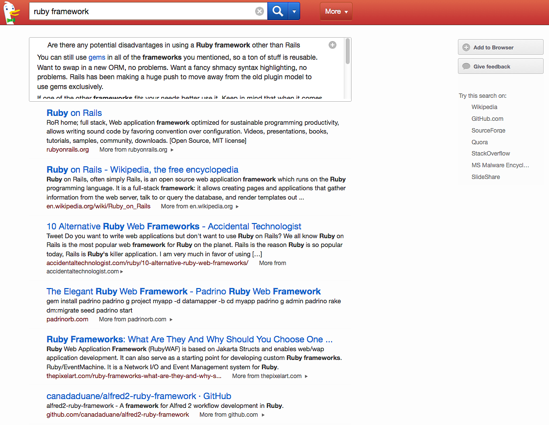 I have noticed that the search results differ vastly from Google’s regarding the number of results. Google simply offers more results than DuckDuckGo. It is simple numbers. Google has been around longer and has had time to build the most popular search engine. However, I can find what I am looking for on DuckDuckGo most of the time. Where the results haven’t been successful on DuckDuckGo, I can append the !g operator on my search to tell it that I want to search Google. I don’t use this often now, but having it is nice.