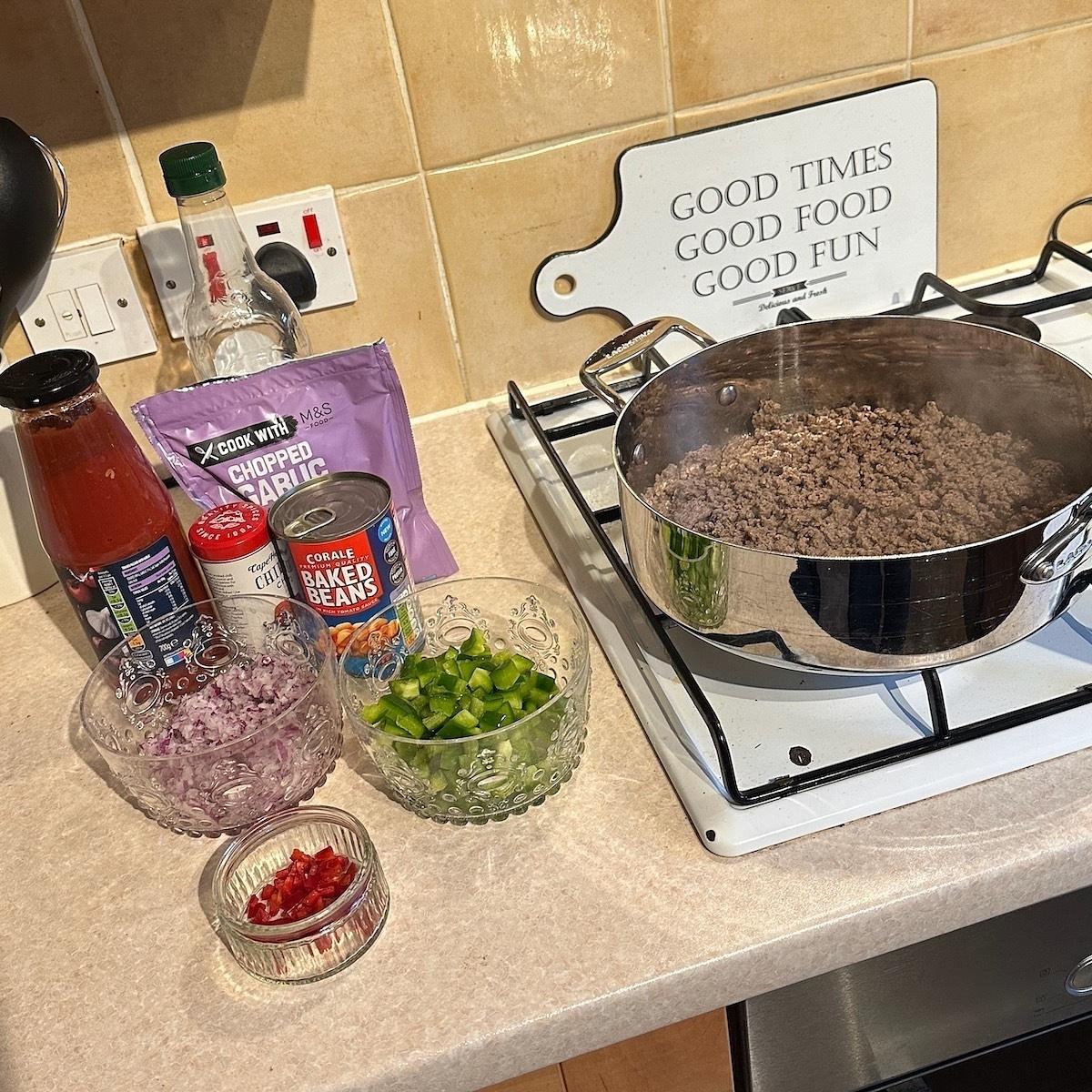 A Mother’s Day request from Jennifer, chilli for dinner with all her usual favourite sides. Some rice, chips, guacamole, and sour cream. I’m sure she’ll be happy with that.