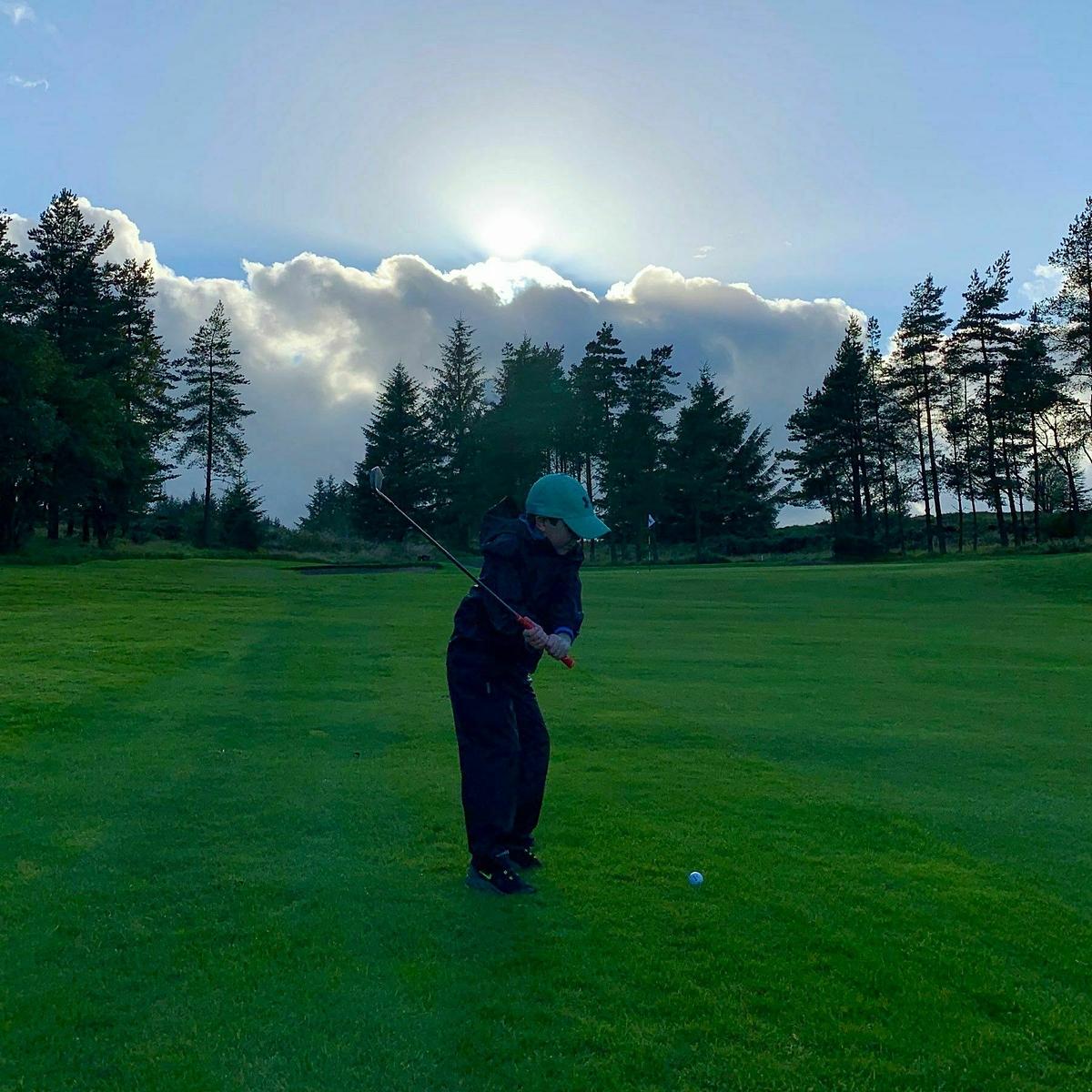 It’s just me and my boy out on the course tonight. He’s playing well and finished with a superb 4 from the blue tee, which is about 150 yards out.